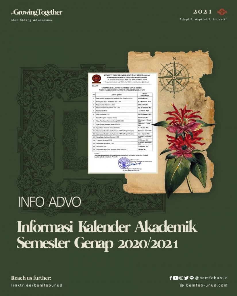 Diinformasikan kepada seluruh mahasiswa/i Fakultas Ekonomi dan Bisnis Universitas Udayana bahwa terdapat perubahan Kalender Akademik Semester Genap 2020/2021