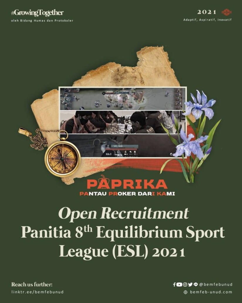 Diinformasikan kepada seluruh mahasiswa/i Fakultas Ekonomi dan Bisnis Universitas Udayana angkatan 2020, bahwa telah dibuka pendaftaran kepanitiaan 8th Equilibrium Sport League