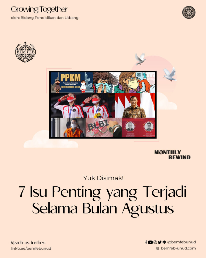 Monthly Rewind bulan Agustus mengemas 7 isu penting yang terjadi, diantaranya: Diperpanjang Sebanyak 5 Kali, Aturan PPKM Level 4 Jawa-Bali Kembali Diperpanjang Hingga 30 Agustus 2021; Covid-19 Diprediksi Akan Bertransformasi Menjadi Endemi, Apa Bedanya Dengan Pandemi?; Kerja Sama China-Indonesia Bangun Pabrik Vaksin di Tanah Air Menuai Kritik dari Beberapa Pihak. Berikut ulasannya; Vonis Juliari Batubara Diringankan karena Cacian Publik Menuai Polemik; Membanggakan! Prestasi Atlet Indonesia dalam Olimpiade Tokyo 2020 Menjadi Hadiah di Bulan Kemerdekaan; Kasus BLBI Tak Kunjung Surut, 48 Nama Tercatat Telah Dilakukan Pemanggilan; dan OJK-Kemenkominfo Perkuat Digitalisasi di Sektor Jasa Keuangan.