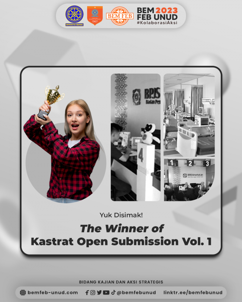Pada tanggal 4 Maret 2023 Bidang Kajian dan Aksi Strategis BEM FEB Unud 2023 melakukan Open Submission melalui konten KASUS Vol. 1 dengan tema “Dampak Terwujudnya Penyesuaian Standar Kelas BPJS Kesehatan bagi Pemerintah serta Masyarakat.”