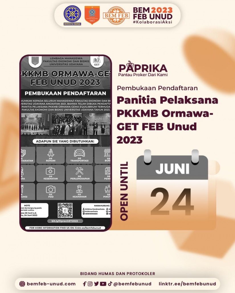 Pembukaan Pendaftaran Calon Panitia Pelaksana PKKMB Ormawa-Gema Equilibrium Termuda (GET) FEB Unud 2023