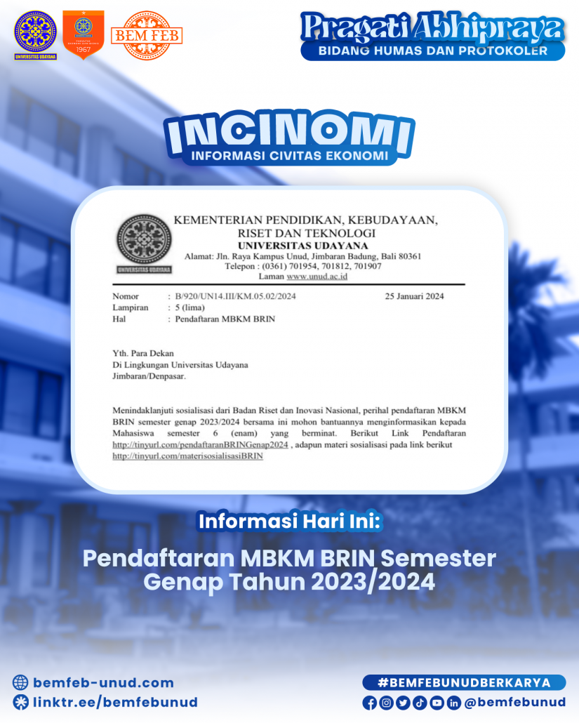 Diinformasikan kepada seluruh mahasiswa/i Fakultas Ekonomi dan Bisnis Universitas Udayana, berikut merupakan informasi mengenai pendaftaran MBKM BRIN Semester Genap Tahun 2023/2024, bagi mahasiswa/i semester 6 (enam) yang berminat.