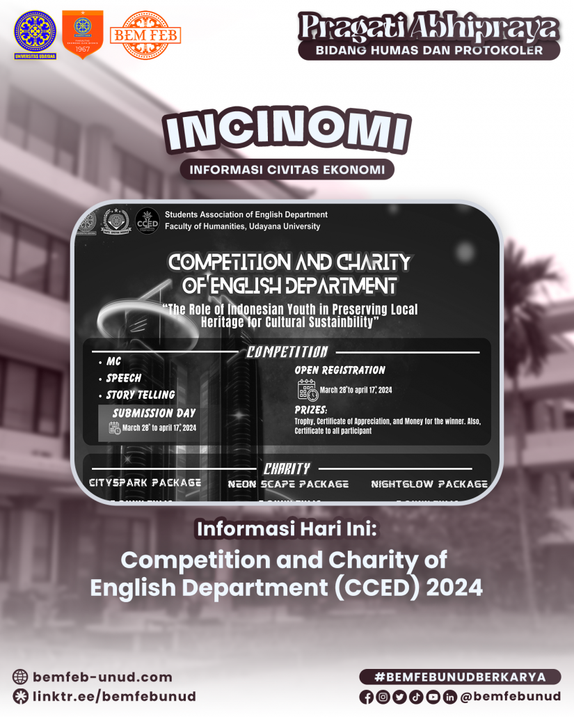 The annual event of Competition and Charity of English Department (CCED) 2024 proudly presented by Students Association of English Department of Udayana is back under the theme: