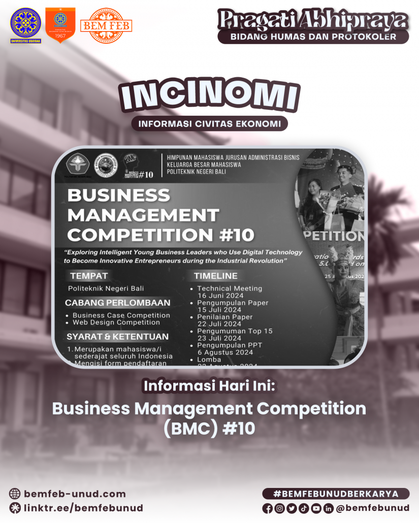 Diinformasikan kepada seluruh mahasiswa/i Fakultas Ekonomi dan Bisnis Universitas Udayana, berikut merupakan informasi mengenai Business Management Competition (BMC).