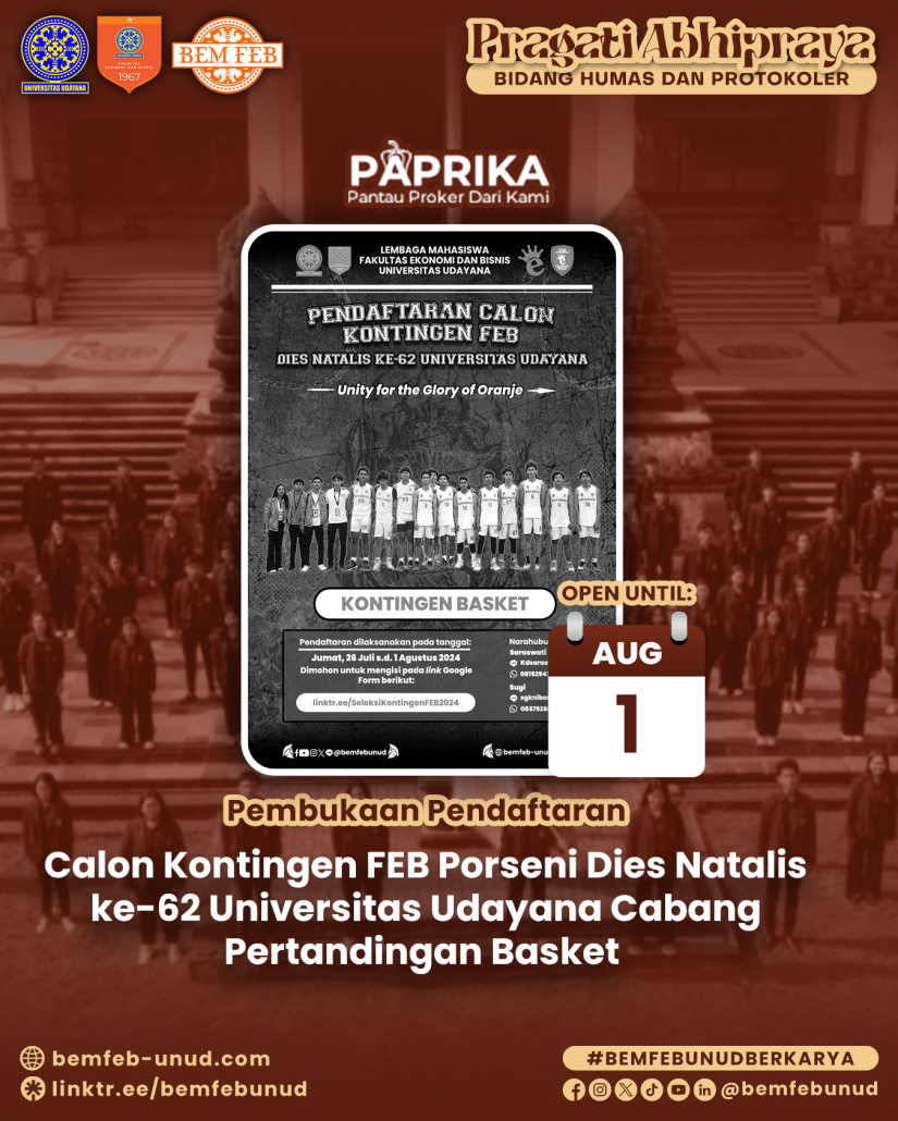 Diumumkan bagi seluruh mahasiswa/i Fakultas Ekonomi dan Bisnis Universitas Udayana bahwa telah dibuka pendaftaran Calon Kontingen FEB PORSENI Dies Natalis ke-62 Universitas Udayana Cabang Pertandingan Basket.