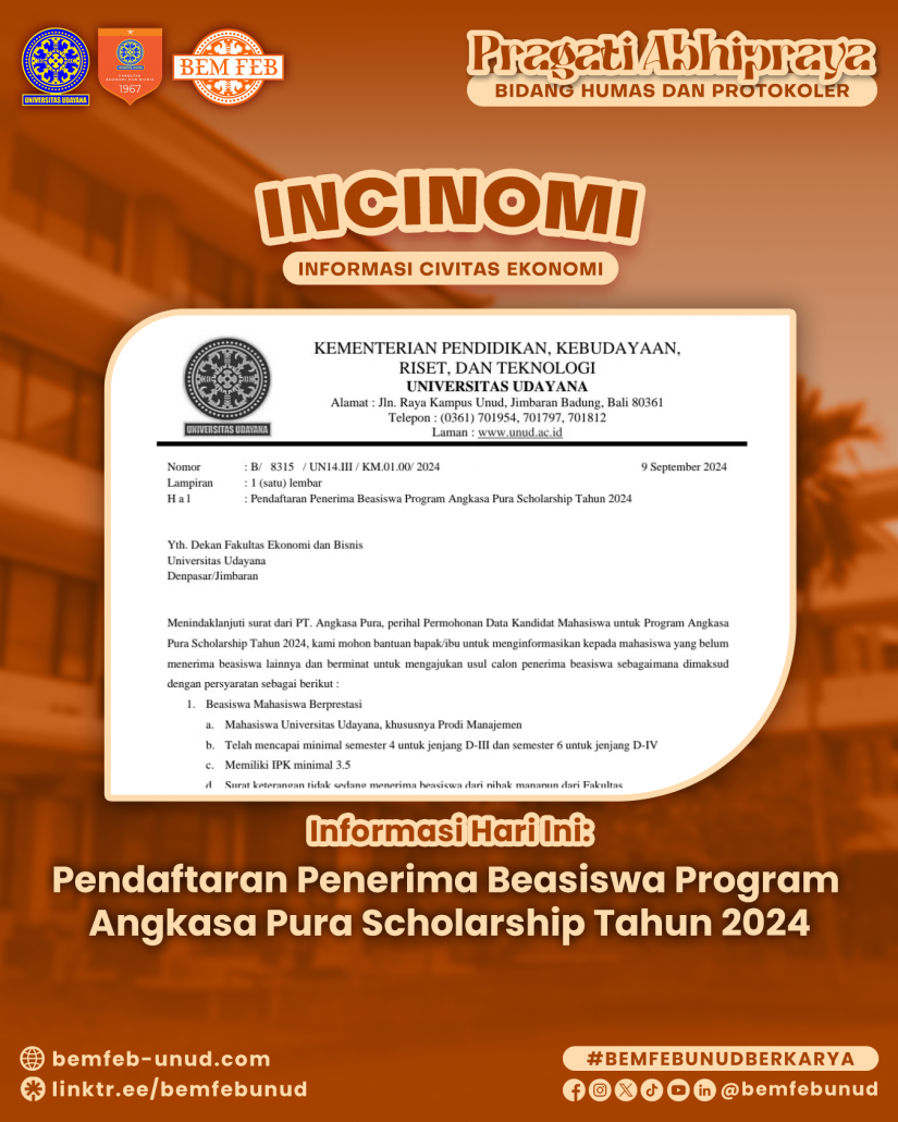 Diinformasikan kepada seluruh mahasiswa/i Fakultas Ekonomi dan Bisnis Universitas Udayana, berikut merupakan informasi mengenai Pendaftaran Penerima Beasiswa Program Angkasa Pura Scholarship Tahun 2024.