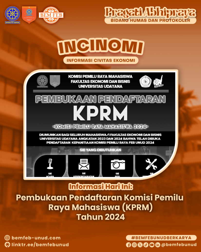 Diinformasikan kepada seluruh mahasiswa/i Fakultas Ekonomi dan Bisnis Universitas Udayana, berikut merupakan informasi mengenai Pembukaan Pendaftaran Komisi Pemilu Raya Mahasiswa (KPRM) Tahun 2024