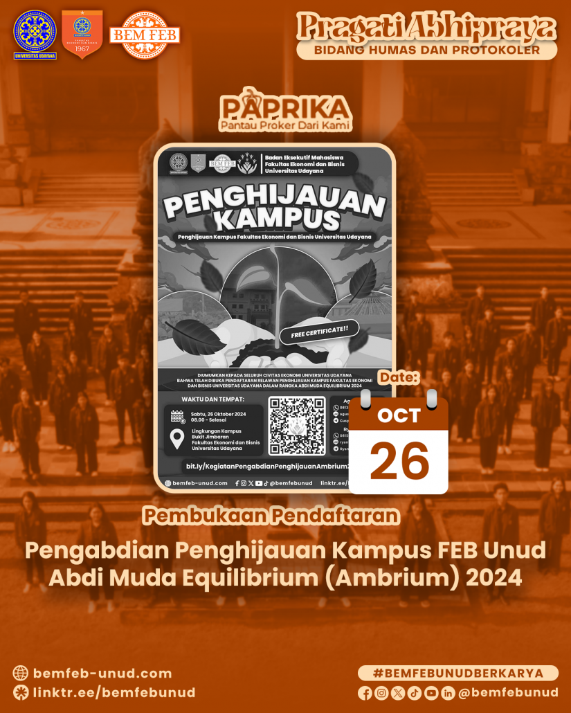 Diumumkan kepada seluruh tenaga pendidik dan mahasiswa/i Fakultas Ekonomi dan Bisnis Universitas Udayana bahwa telah dibuka Pendaftaran Relawan Penghijauan. Bagi seluruh tenaga pendidik dan mahasiswa/i Fakultas Ekonomi dan Bisnis Universitas Udayana yang ingin berpartisipasi menjadi relawan dapat mengisi link dibawah ini: