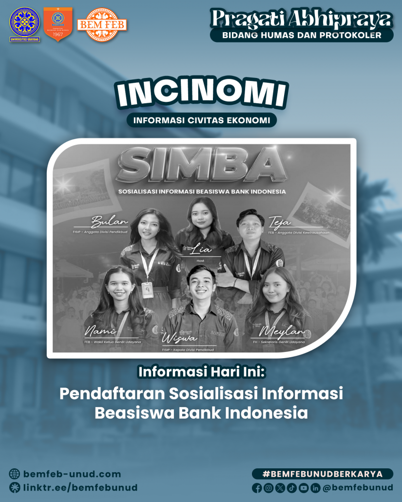 Diinformasikan kepada seluruh mahasiswa/i Fakultas Ekonomi dan Bisnis Universitas Udayana, berikut merupakan informasi mengenai Pendaftaran Sosialisasi Informasi Beasiswa Bank Indonesia.