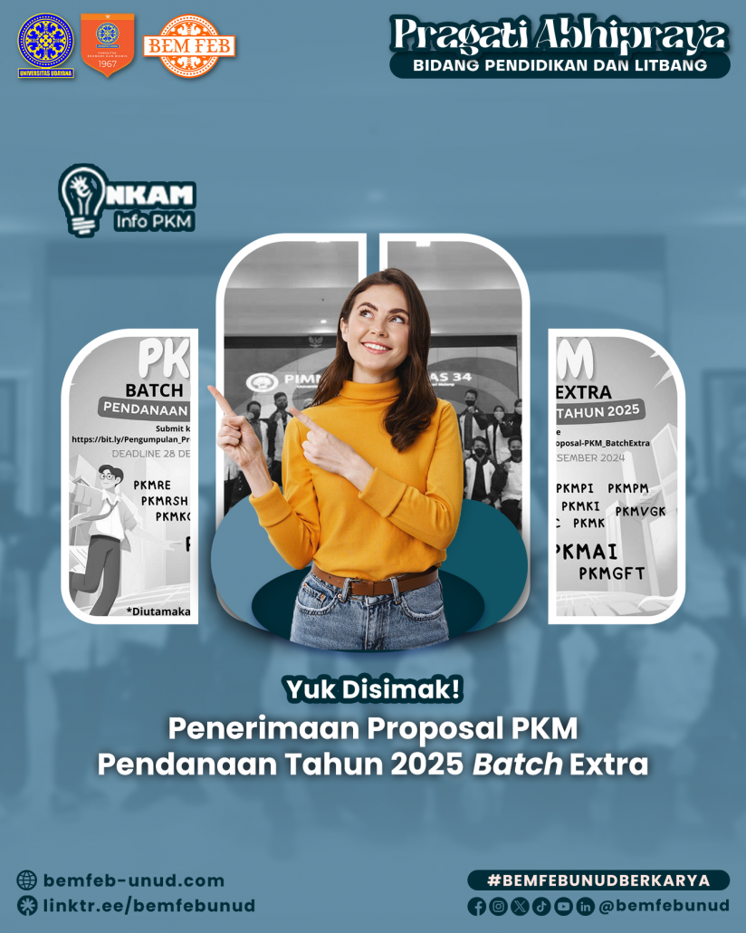 Diinformasikan kepada seluruh mahasiswa/i Fakultas Ekonomi dan Bisnis Universitas Udayana, berikut merupakan informasi mengenai penerimaan proposal PKM pendanaan tahun 2025 batch extra.