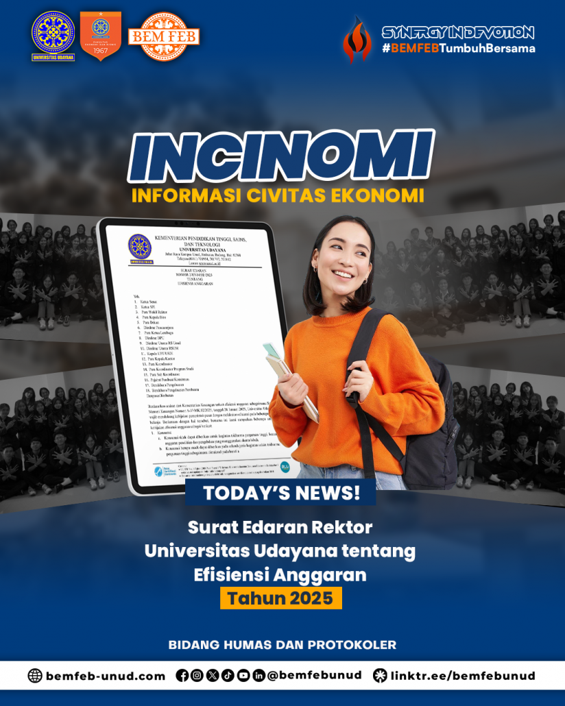 Diinformasikan kepada seluruh mahasiswa/i Fakultas Ekonomi dan Bisnis Universitas Udayana, berikut merupakan informasi mengenai Surat Edaran Rektor Universitas Udayana tentang Efisiensi Anggaran