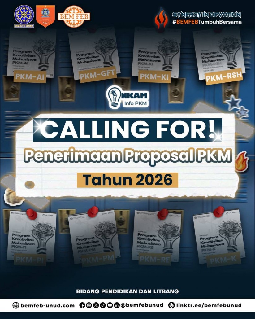 Diinformasikan kepada seluruh mahasiswa/i Fakultas Ekonomi dan Bisnis Universitas Udayana, berikut merupakan informasi mengenai Penerimaan Proposal Program Kreativitas Mahasiswa (PKM) Tahun 2026 baik dari skema 8 bidang maupun skema insentif.