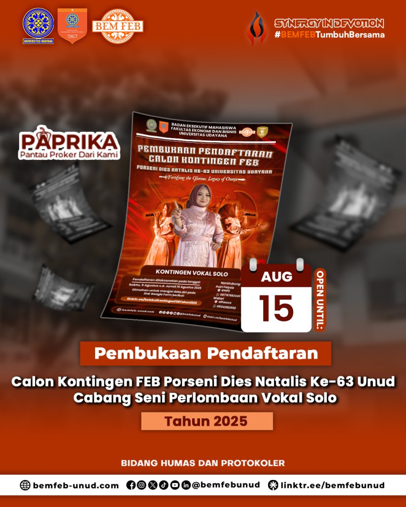Diumumkan bagi seluruh mahasiswa/i Fakultas Ekonomi dan Bisnis Universitas Udayana bahwa telah dibuka pendaftaran Calon Kontingen FEB PORSENI Dies Natalis ke-63 Universitas Udayana Cabang Seni Perlombaan Vokal Solo.