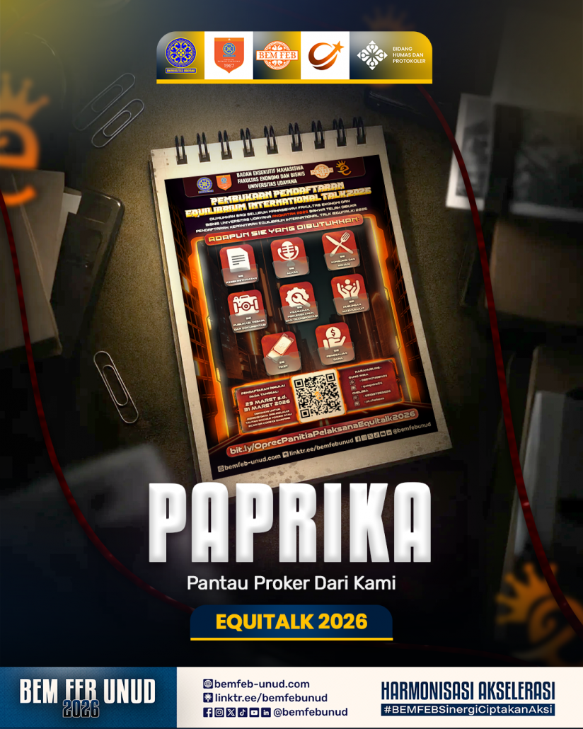 Diumumkan bagi seluruh mahasiswa/i Fakultas Ekonomi dan Bisnis Universitas Udayana angkatan 2025 bahwa telah dibuka pendaftaran kepanitiaan Equilibrium International Talk (Equitalk) 2026