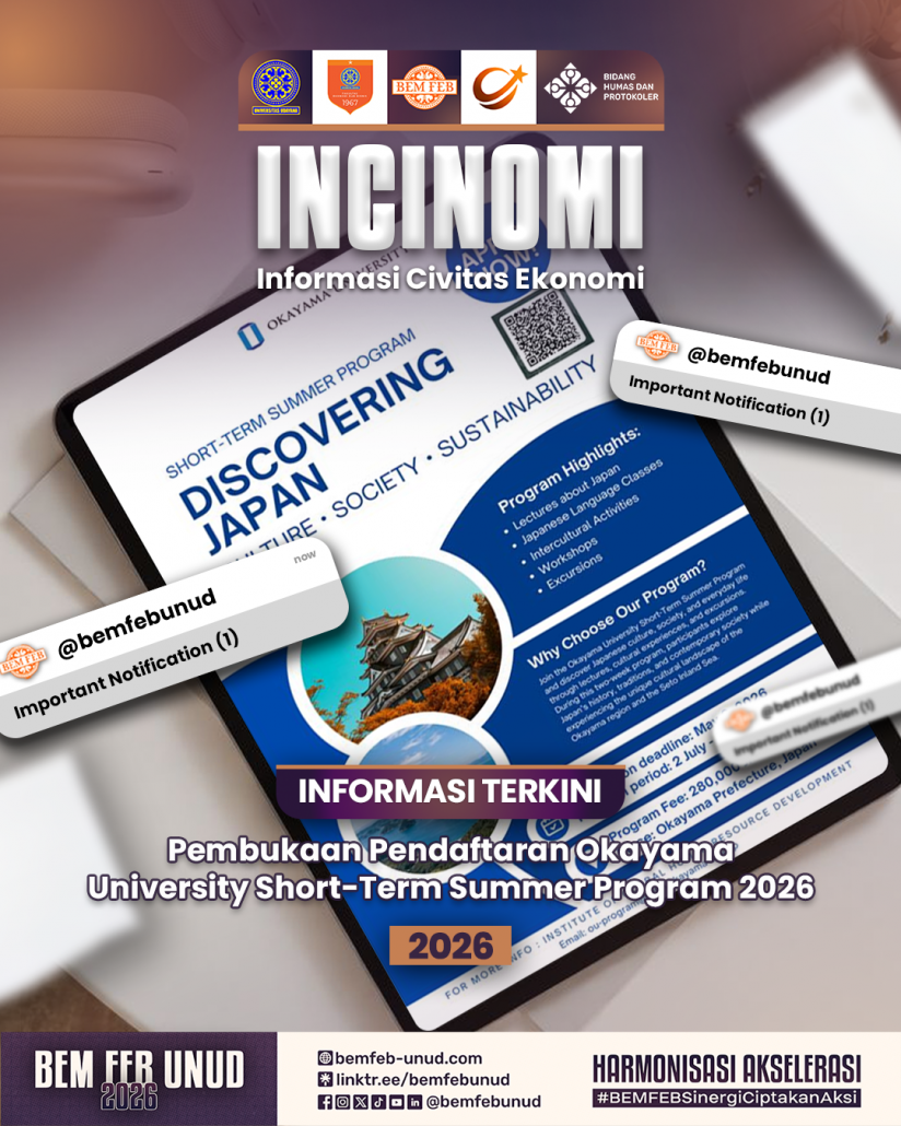 Diinformasikan kepada seluruh mahasiswa/i Fakultas Ekonomi dan Bisnis Universitas Udayana bahwa terdapat informasi mengenai Okayama University Short-Term Summer Program 2026 dengan tema “Discovering Japan: Culture, Society, Sustainability” yang diselenggarakan oleh Okayama University, Jepang.